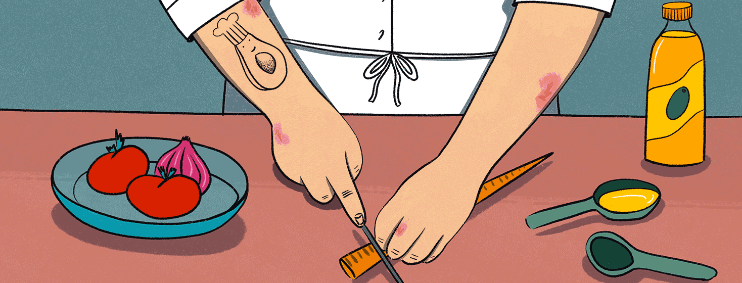 I am a professional chef living with psoriasis and want a tattoo. An avocado wearing a chef's hat is the design I am choosing for my tattoo. He represents the love I have for cooking and my mom who taught me to cook. Chef Cado as I call him is a reward for graduating from culinary school with honors.